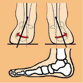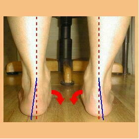 ら垂直に引いた2本の赤い点線に対して、 アキレス腱からカカトに引いた青線が中心 から外側に向かっています。足は体の中心 に向かって倒れ込みます(赤い矢印)。足に 体重がかかれば、足の親指側に負担がかか り、足の内側の縦アーチを低下させてしま います。足の内側が床や靴底に強く接し、 小指側が浮き上がるようになります。ひど い場合は内くるぶしの下が腫れて痛みだし ます。 |