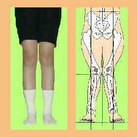ることで、脚が体の中心に傾斜して、膝と 膝とがぶつかるX脚になりやすい傾向があ ります。つま先も体の中心に向かいやす く、いわゆる内股になることが多いので、 歩いたり走ったりしているうちに、両足の つま先や膝同士がぶつかり合って、ころん でしまうこともあります。X脚が強くなる と膝の外側に体重がかかるので、膝の外側 が痛くなることがあります。 |